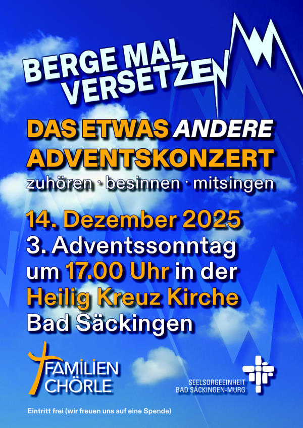 „Berge mal versetzen“ lautet das Motto und lädt ein zum zuhören, besinnen und mitsingen. Eintritt frei, der Chor freut sich über eine Spende.